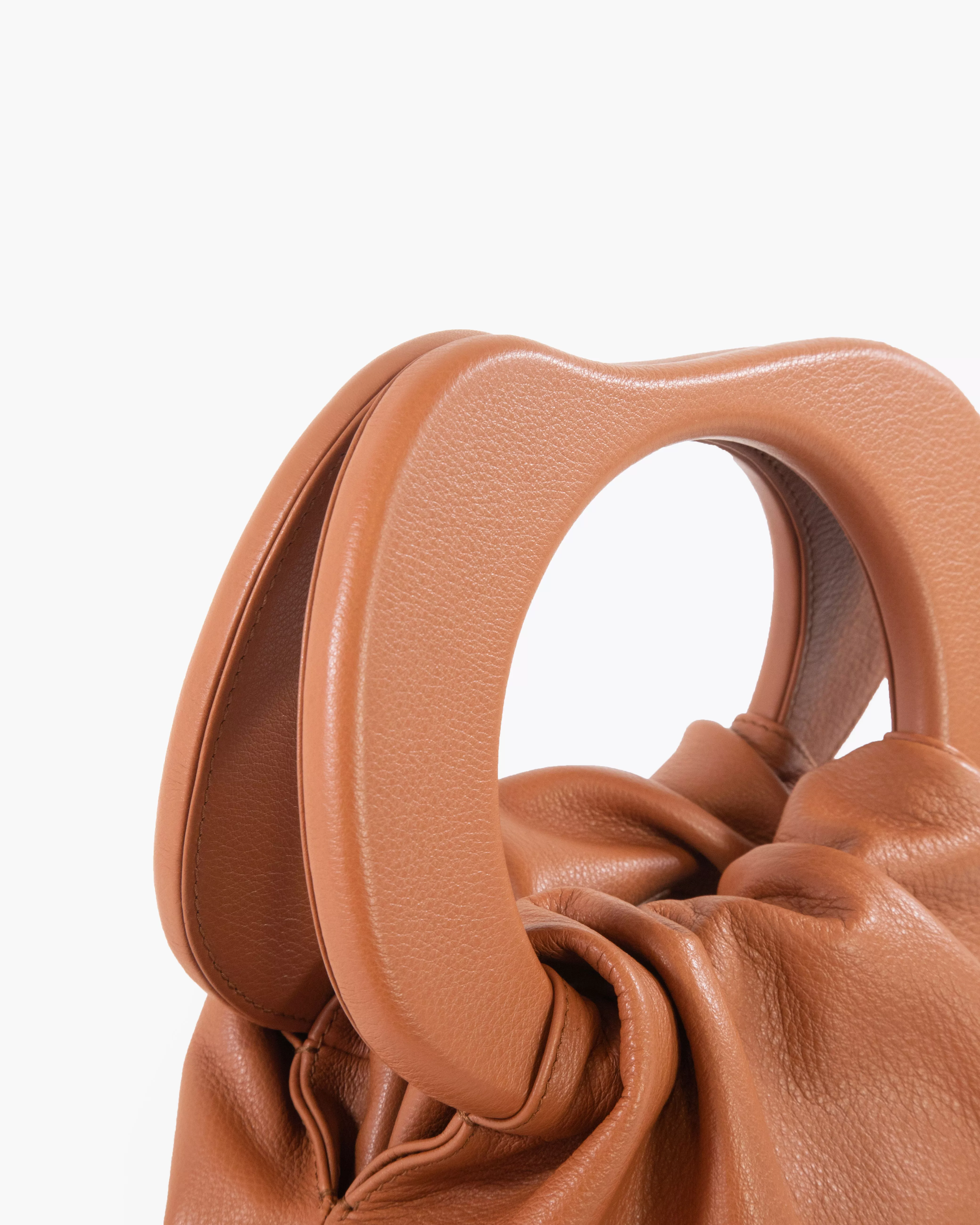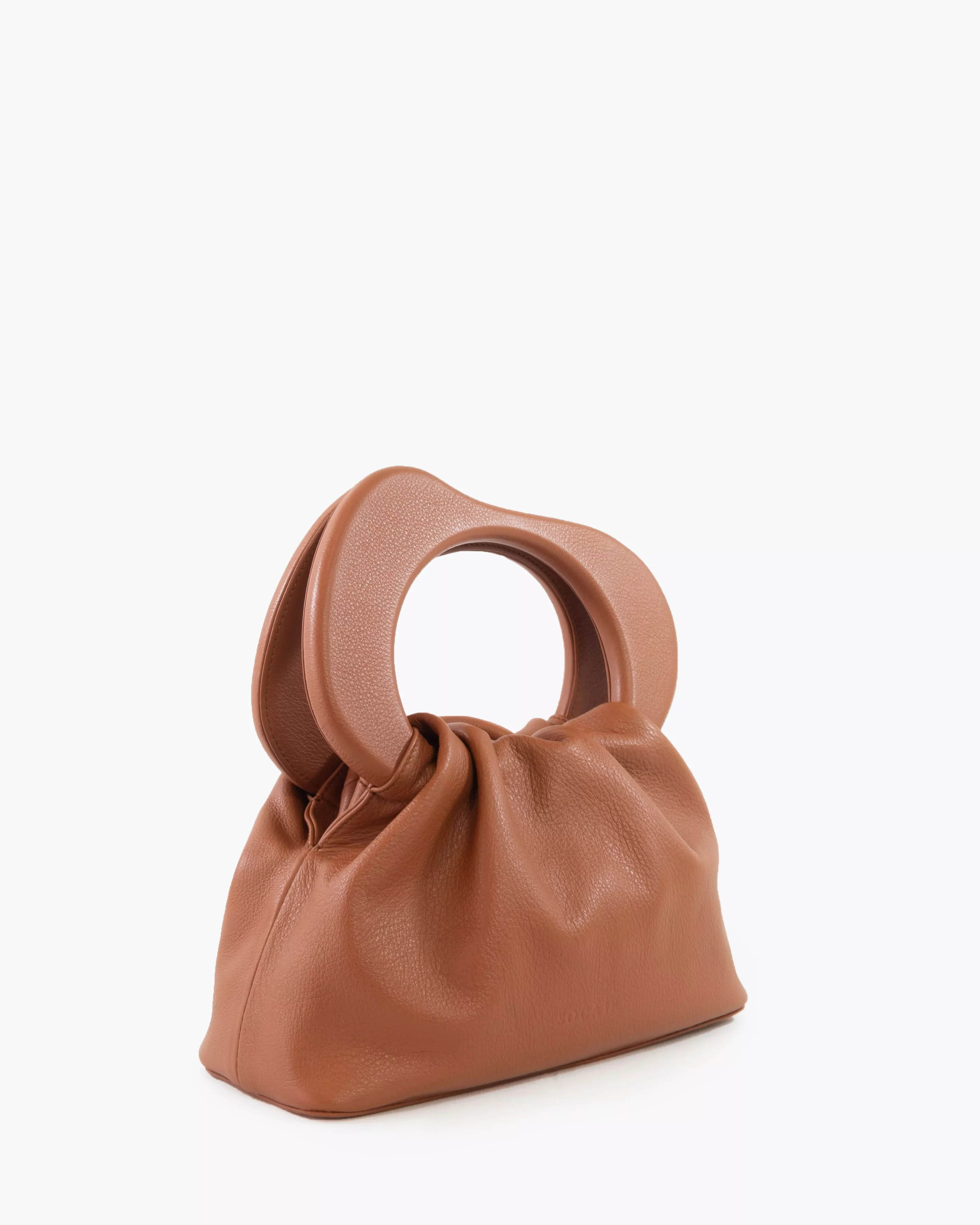 Bolso de mano hecho en piel de vacuno suave anapado, con el asa hecha de madera y piel. Forro de piel.